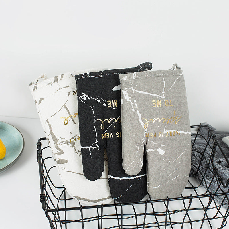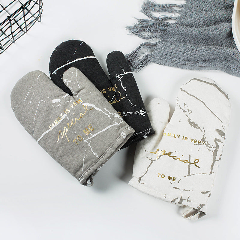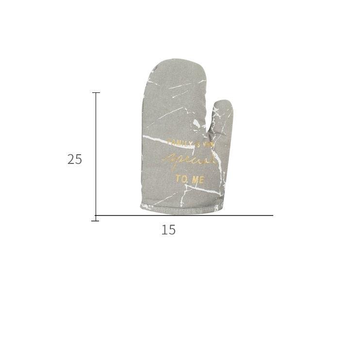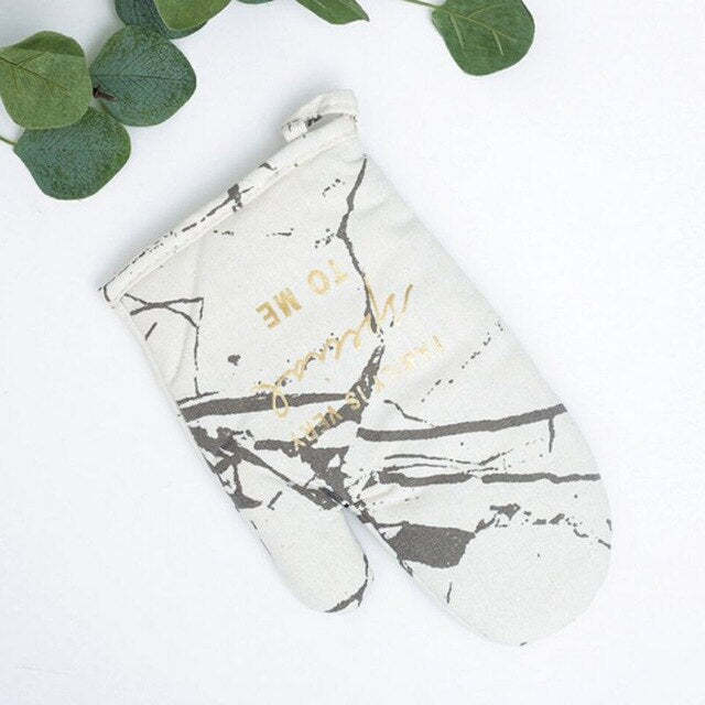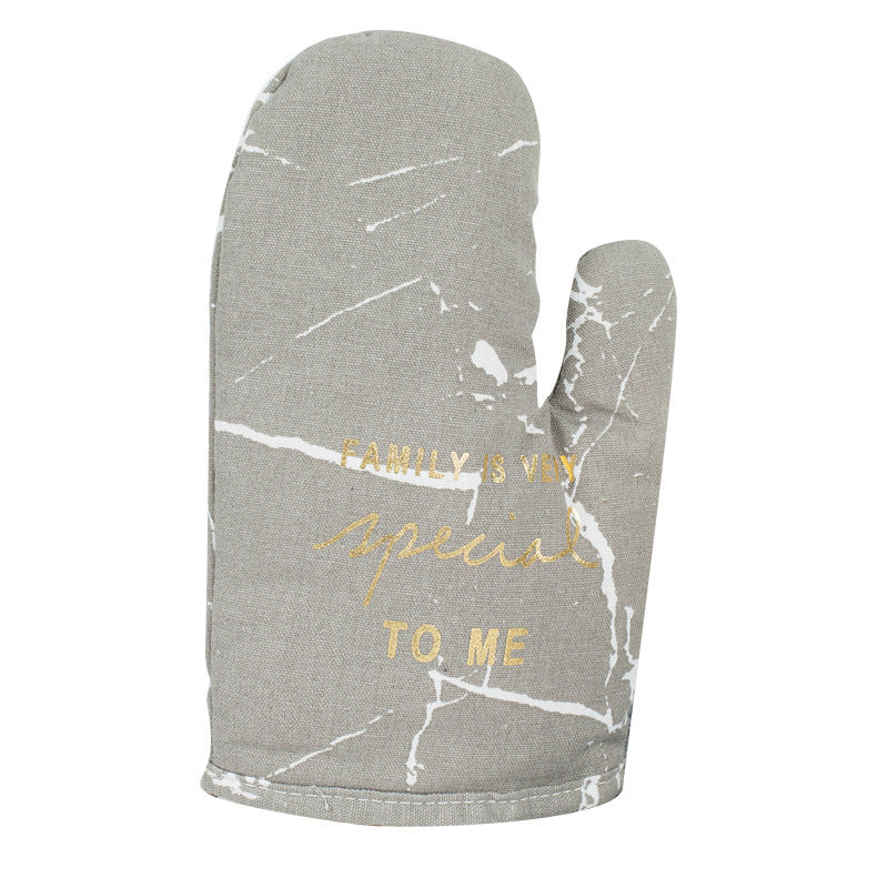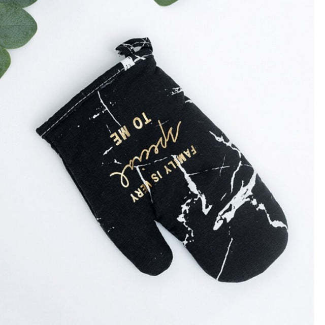 Bring comfort and style into your kitchen with the BloomNBoom Modern Fabric Oven Glove. Made from durable fabric with a marble-effect print and motivational gold lettering (“Family is very special to me”), this glove combines practicality with personality. Its heat-insulated design makes it safe for ovens, microwaves, and baking while adding a touch of modern simplicity to your kitchen.