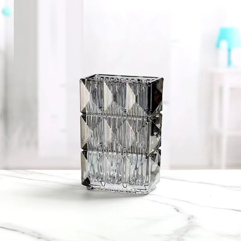 • Size/Variants: Flat square vase in amber, smoke gray, colorful, or clear